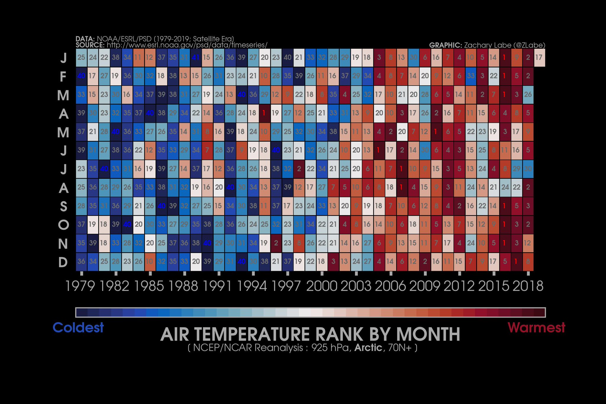 De maand december 2019 noteert een 5e plaats in de lijst van de laagste zee-ijs omvang sinds het satelliettijdperk. De hoeveelheid ligt 890.000 km² onder het gemiddelde van 1981-2010.