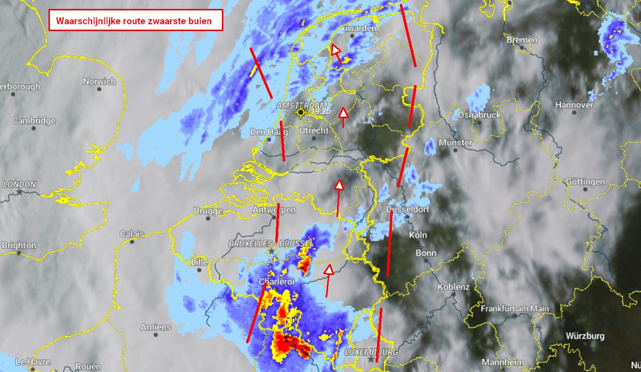 We verwachten deze route van de zwaarste buien later vanavond en vannacht. het kan vooral flink regenen, soms ook stevig onweren. https://www.weerplaza.nl/weerinhetnieuws/warmte-veroorzaakt-vanavond-mogelijk-fors-