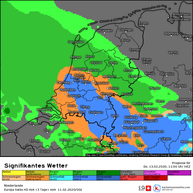 Al met al verwacht ik dus niet heel veel van de situatie. Toch is neerslagafkoeling altijd een lastig punt voor de weermodellen en afhankelijk van meerdere factoren. Als het front iets actiever blijkt te zijn, de passage iets vroeger komt en het de nacht van te voren iets kouder is geweest als aanvankelijk verwacht, dan zijn winterse verrassingen wel mogelijk. Het blijft dus met name afwachten tot donderdagochtend, maar ik zou me er niet te veel op verheugen ;) Overigens is de grootste kans op wat (natte) sneeuw voor het oosten en noorden.
