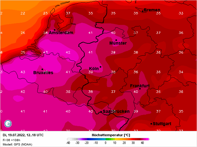 Met nog +108 uur begint het nu toch wel echter dichterbij te komen, GFS laat nog steeds temperaturen zien van 43 graden waarmee het hitte record voor Nederland wederom verhoogd zou worden. Ook voor de bilt zien we een 40+ ingetekend staan.