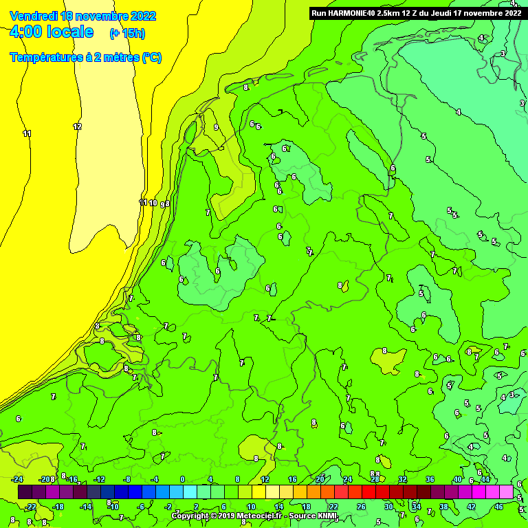 Vannacht juist het tegenovergestelde, met een beetje geluk komt het vannacht tot de eerste vorst op 1.5 meter, harmonie tekent lokaal wat vorst in, de kans lijkt mij vrij groot dat het inderdaad op een van de stations tot vorst gaat komen. Zeker gezien de nu al sterke temperatuurdaling in de gebieden waar het momenteel helder is.